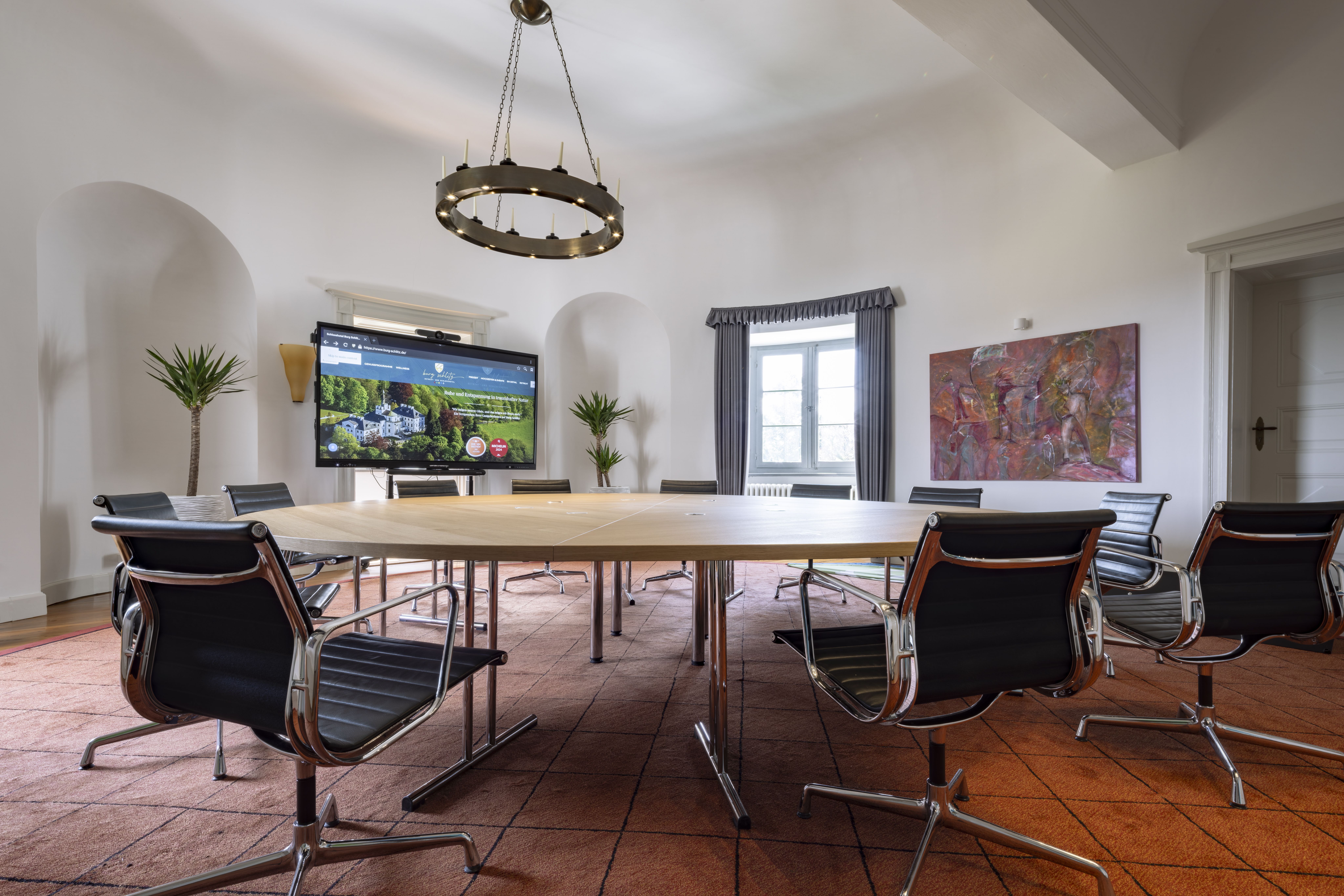 Begrüßungskaffee mit einer Etagere süßem Gebäck und herzhaften Canapés, Kaffeepause mit frischem Fruchtsaft, Müsli und einem Obstkorb, Saisonales Mittagsmenü in drei Gängen oder Buffett, Unlimitiertes Wasser, Kaffee, Tee und Softgetränke im Tagungsraum, Kaffeepause mit Smoothies, Kuchenauswahl, Gemüse mit Dips Technik (Smartboard, Flipchart, Moderatorenkoffer, Beamer und Leinwand), Bereitstellungskosten für den Tagungsraum WLAN – Internetzugang